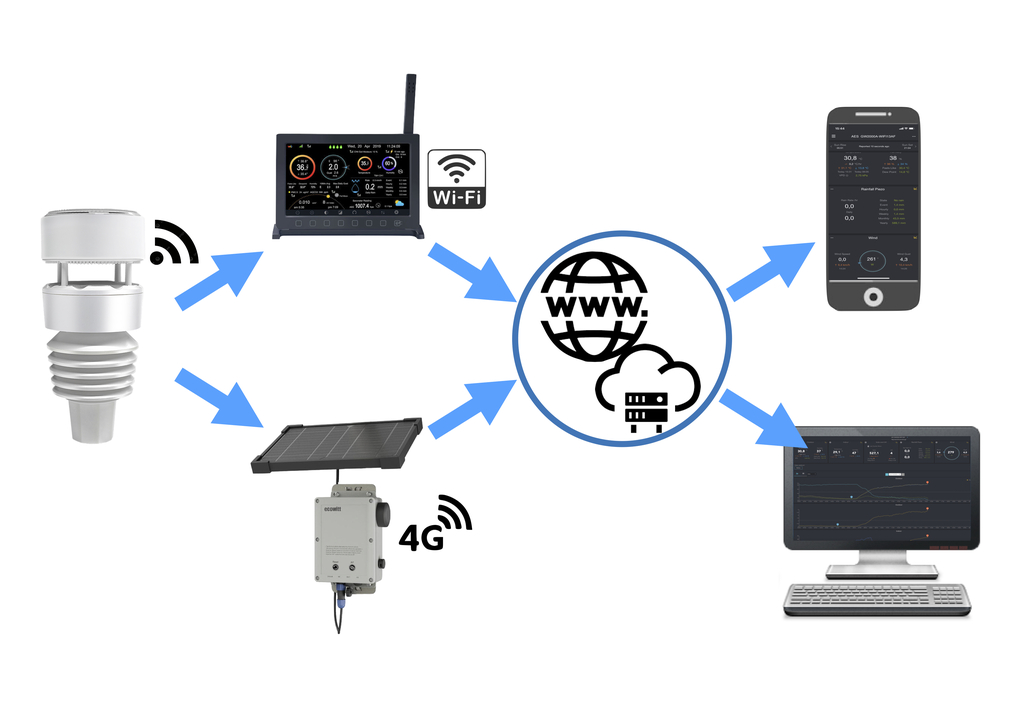 Datele sunt transmise automat către serverul ecowitt la interval de 1 minut. Pot fi vizualizate direct pe server, grafice, tabele cu valori, statistici zilnice, săpămânale, lunare sau anuale. Pe calculator, se accesează serverul la adresa ecowitt.net. Pentru smartphone se instalează ecowit app.